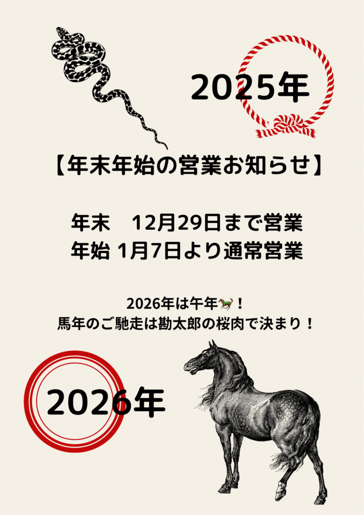 2025年も残すところあとわずかとなりました。お客様には、低カロリー・高タンパクな「桜肉(馬肉)」を安心安全に楽しんでいただけたことを、心より感謝申し上げます。